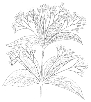 Huge domes (1 foot or more broad!) are formed by clusters of tiny rosy-mauve flowers from July through September, leaves up to 14 inch long are arranged in whorls of 4 to 5 up the stem, a very bold plant, clay tolerant, good rain garden plant, attracts butterflies, caterpillar host.
