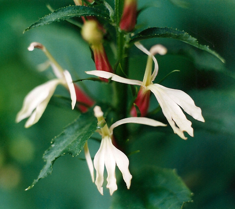 A spectacular uncommon white form of Cardinal flower that produces unusual bicolored white and pale pink flowers from August through September, basal rosette of 1-4 inch leaves all year, short-lived perennial that forms rosettes of new plants from the base, does well along ditches or streams, does not tolerate being completely covered by leaves or mulch all winter, will self sow in favorable conditions, clay tolerant, attracts butterflies & hummingbirds, a good rain garden plant.