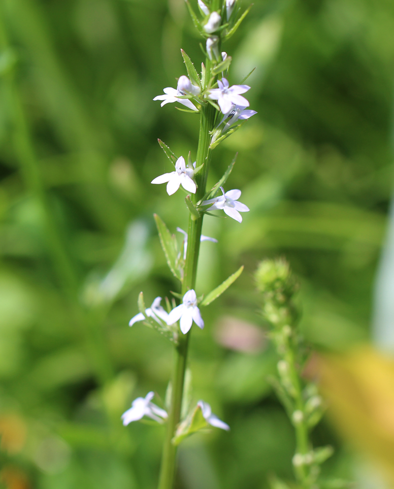 Showy tall spikes of 1/2 inch pale blue to white lipped flowers from June through August, basal rosette of leaves is semi-evergreen, pollinated by native bees, tolerant of rocky soil, attracts butterflies. A more delicate-looking cousin of Great Lobelia and Cardinal flower that is more tolerant of drier conditions. Somewhat short-lived for a perennial, so allow it to seed in.