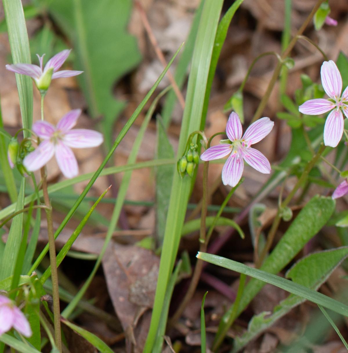 First of all, here in the mid-Atlantic, there are 2 species of Spring Beauties that you might encounter: the Virginia Spring Beauty, Claytonia virginica, is the only Spring Beauty that is native to NJ, but in New England, New York, Pennsylvania, and down the Appalachians you can also find not only the Virginia Spring Beauty, but also the subtly different species Claytonia caroliniana, known as the Carolina Spring Beauty. There are other Spring Beauties in other parts of the country, but those two species are the only ones you are going to encounter along the east coast.